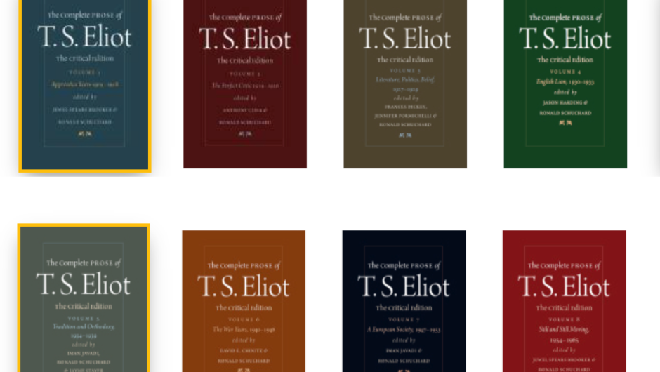 The Complete Prose of T.S. Eliot: The Critical Edition is an 8-volume annotated publication featuring all extant published and unpublished prose of the poet T.S. Eliot. Edited by a team of scholars led by Emory professor emeritus Dr. Ronald Schuchard, the text of the edition was encoded for web publication by ECDS.
